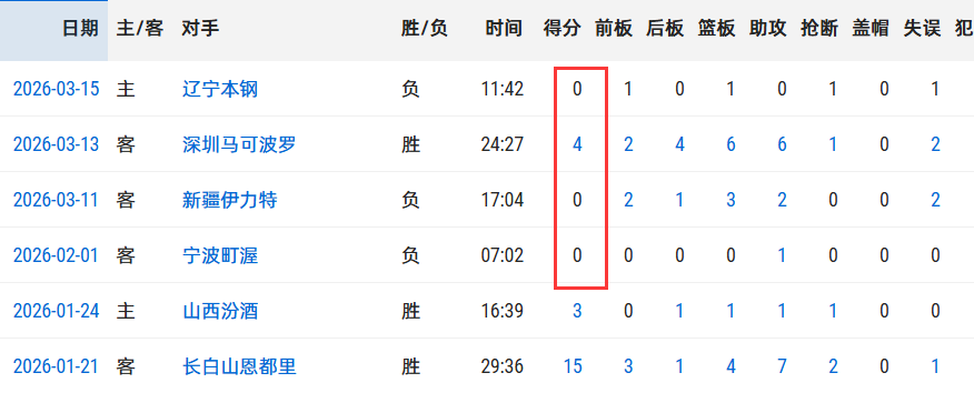 最近5场常规赛,广东仅1胜4负,期间徐杰有3场得分挂0,第21轮对阵宁波,徐杰2中0拿到0分(伤退离场),二阶段第1场面对新疆,徐杰6中0得0分,上一轮面对深圳,徐杰表现稍微有所起色,2中1拿到4分6板6助,本以为徐杰找回了状态,没想到辽粤大战又拉胯了。